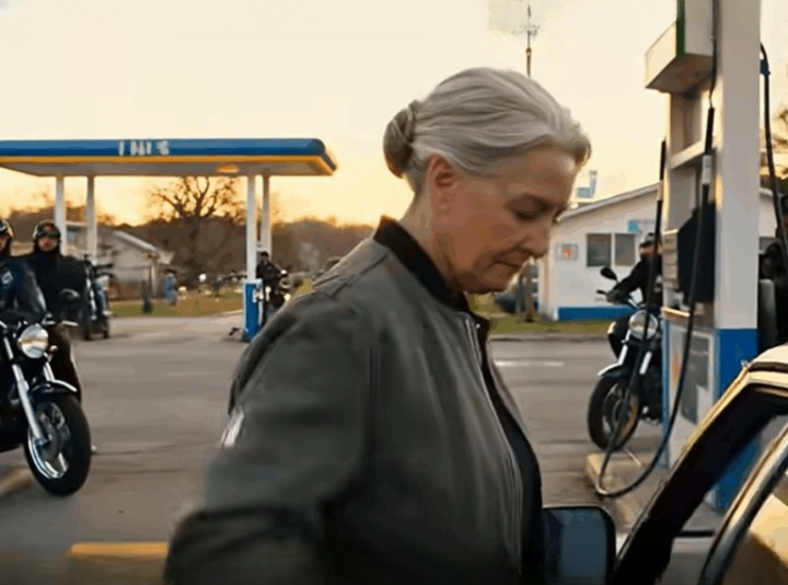 By the pump, Margaret Thompson, 90, adjusted the gas cap on her old Ford, silver hair tucked neatly into a bun. She didn’t flinch at the noise.