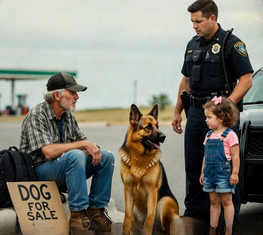 Daniel’s foot eased off the accelerator. Something about the scene tugged hard at his chest. It wasn’t the desperation of the sale itself, but the quiet, loyal posture of the dog—alert, patient, almost expectant.