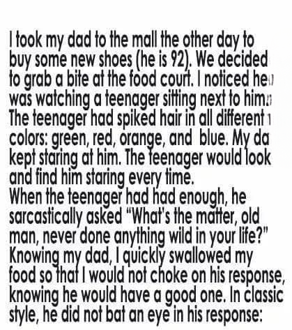 When we finished eating, the boy stood up to leave. He paused beside our table. “Sir,” he said shyly, “I really liked what you said. My mom keeps telling me I should stop trying to ‘shock people.’ Maybe I’ll try making them smile instead.”