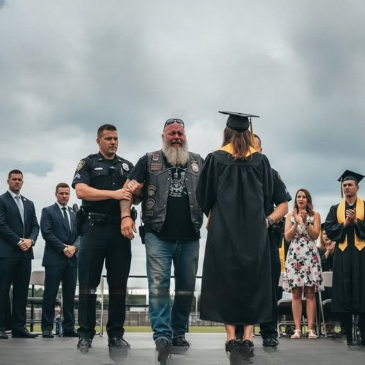 He stood at the back of the auditorium, unmistakably out of place among the suits and silk dresses. His leather vest was cracked and dusty, jeans torn at the knee, hands roughened by years of labor. A murmur ran through the crowd—doctors, professors, parents—all noticing the man who didn’t belong.