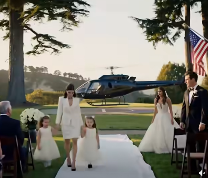 The helicopter door opened, and a woman stepped out — tall, poised, dressed in a white suit that caught the afternoon light. Her hair whipped in the downdraft, yet she moved with the composure of someone who owned the moment. In her hands were two children — a boy and a girl, about six — walking perfectly in rhythm, eyes wide but steady, and far too familiar.