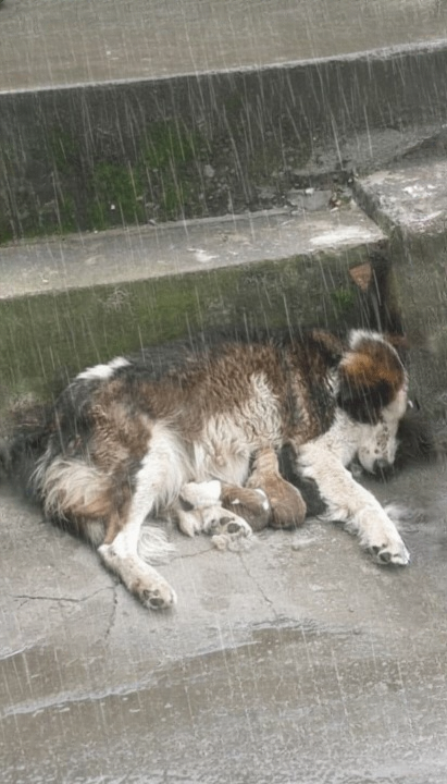 In the forgotten outskirts of an old industrial town—where rusted factories loomed like skeletons against a weary sky and cracked sidewalks whispered of better days—a sudden downpour turned the world into a gray, merciless blur. On the stormy evening of November 6, 2025, thunder rolled across the heavens as rain lashed the streets. There, on the cold concrete steps of an abandoned building, a stray dog—her fur matted with grime and fatigue—collapsed in exhaustion. But she was not alone. Beneath her trembling frame lay four newborn puppies, barely hours old, their fragile bodies pressed against her for warmth.