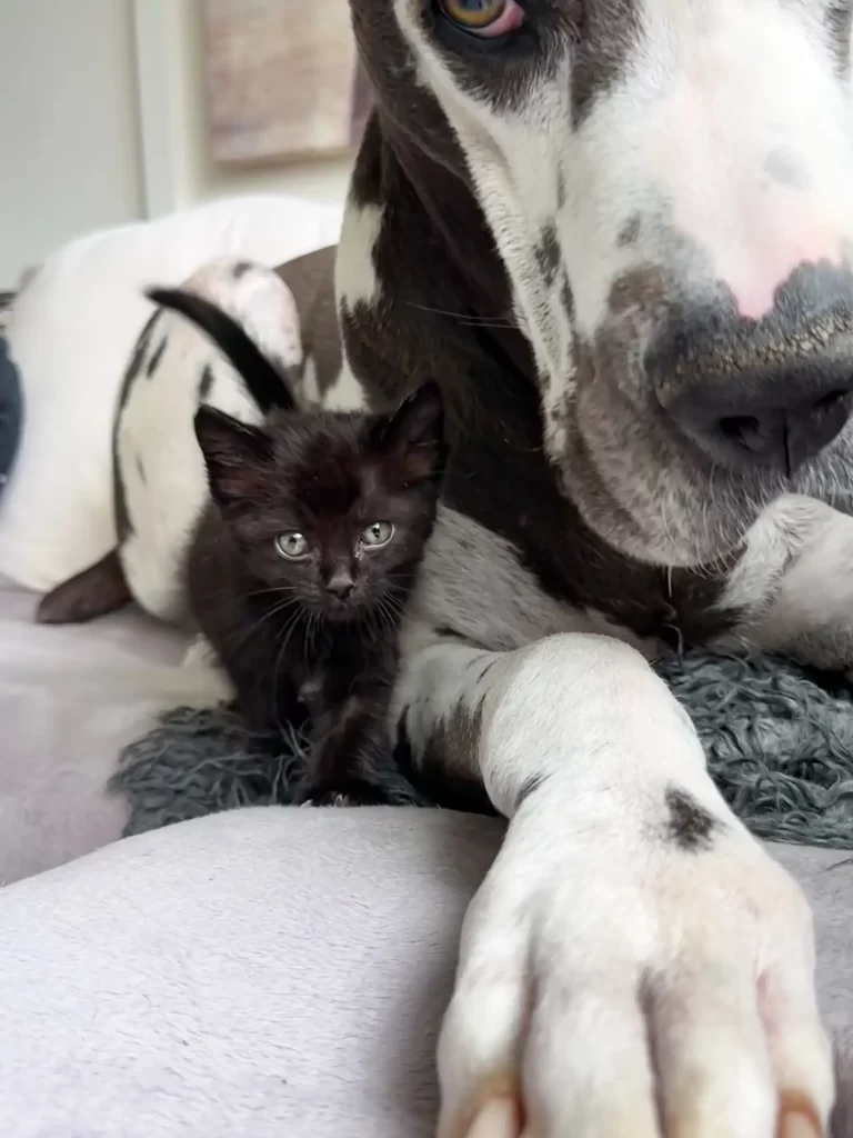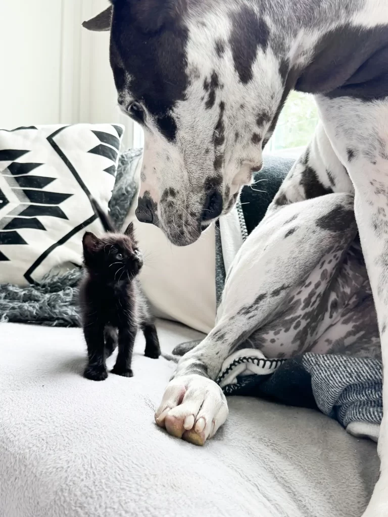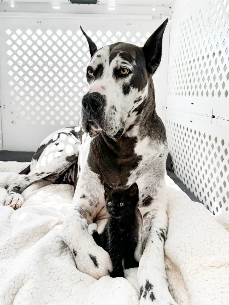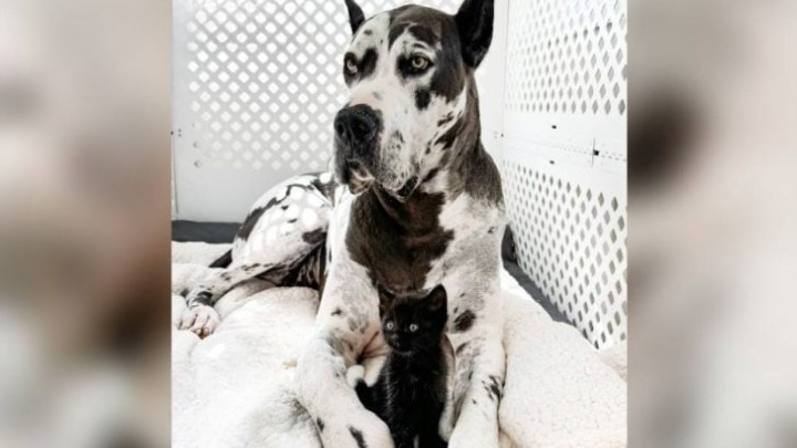 The sight of the massive Great Dane lying quietly beside a handful of tiny kittens never fails to melt hearts.