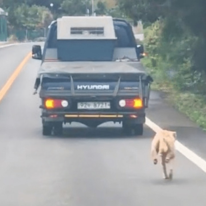 The truck, a blue Hyundai Porter, rolls steadily down a narrow rural road bordered by lush greenery, perhaps near the coast. Behind it, a lean, light-brown dog runs with every ounce of strength she has, her body stretched in motion, eyes locked on the disappearing vehicle ahead.
