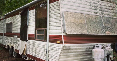 The camper, a NuWa model from the early 1980s, had likely been used for hunting trips before being abandoned. Its exterior was far from appealing, and Mama V referred to it as “ugly” when she first saw it. Despite its worn appearance, the structure was solid, with no leaks, making it a perfect candidate for a renovation project. However, it still required a significant amount of cleaning and updates to be livable. Mama V enlisted the help of friends, Jayme and Kevin, who played crucial roles in getting the trailer ready. Kevin expertly hitched the trailer to his truck and positioned it on its new plot of land, while Jayme took charge of the arduous cleaning process. She removed over a thousand dead wasps and scrubbed every surface until the interior gleamed.