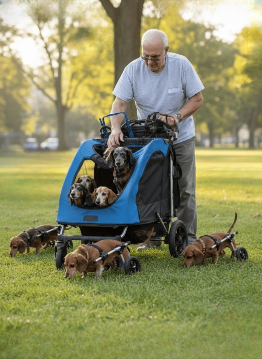 Years later, Gregory’s home is more sanctuary than shelter. Ramps replace stairs, soft beds line every corner, and the steady hum of spinning wheels fills the air. Each morning, after loading his rescues into their specially adapted stroller, Gregory sets out toward the park. There, one by one, he fastens their wheelchairs and offers his familiar whisper: “Go on, kids.”