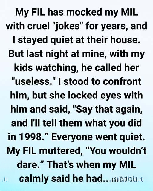 For as long as I’ve known my in-laws, my father-in-law has had a sharp tongue, cleverly disguised as humor. Every family dinner followed a familiar pattern: he’d make a snide comment about my mother-in-law, everyone else would laugh awkwardly, forcing smiles that didn’t reach their eyes, and she would respond with a practiced, gentle, “Oh, that’s just how he is.” Over the years, I watched this dance repeat countless times, each iteration chipping away at my comfort and leaving a sour taste in my mouth.