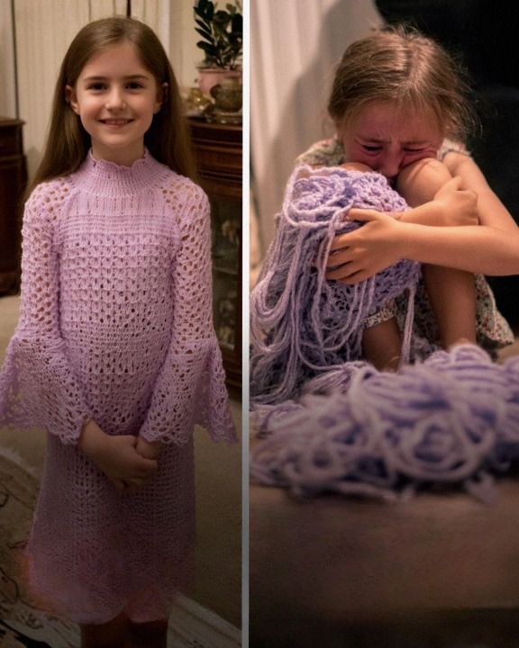 The night before the wedding, an ear-piercing scream shattered the calm of our home. Rushing to Lucy’s bedroom, I found her sitting on the floor, sobbing, surrounded by an unrecognizable pile of lilac yarn. My heart sank. Her beautiful dress, the one I had poured love and care into, had been undone stitch by stitch. It was no accident — someone had deliberately unraveled it, destroying not only the dress but my daughter’s excitement.