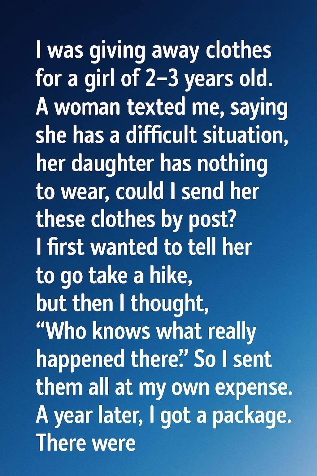 Posted on November 24, 2025 By admin No Comments on I gave a stranger my childs clothes, and a year later I got a surprise package