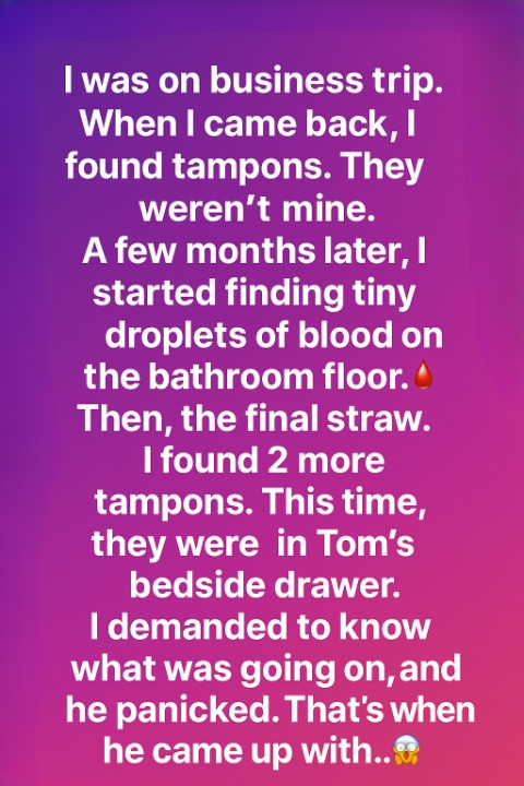 When I returned home after a week-long business trip, I immediately sensed something was off. Everything looked normal — the house was tidy, dinner was on the stove — but small details made my stomach twist. A box of tampons sat beneath the bathroom sink, even though I hadn’t used that brand in years. I shrugged it off at first, telling myself there must be a simple explanation. But as days passed, I began noticing other odd things: faint stains on the bathroom floor, tissues tucked deep into the trash, and my partner Tom growing more distant and uneasy. Something wasn’t right, and the silence between us was only making it worse.