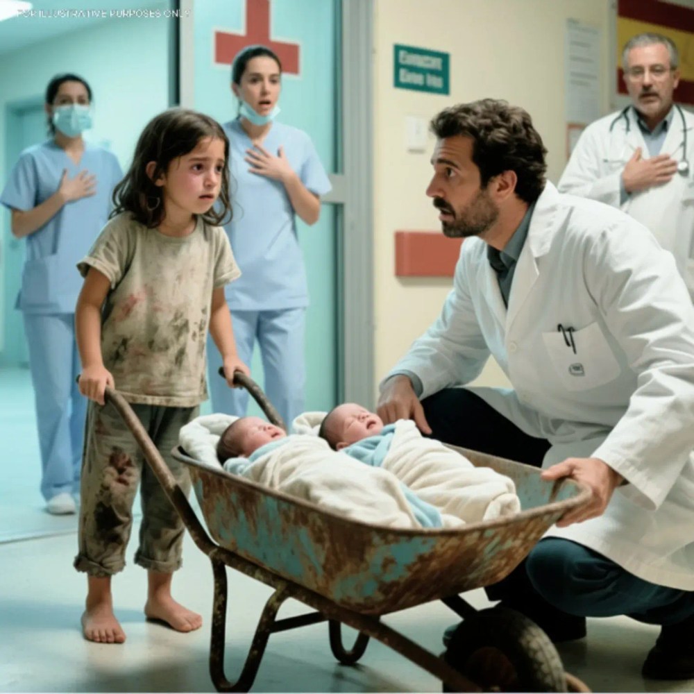 The emergency room at St. Mary’s County Hospital had seen chaos before, but nothing like the sight that arrived that morning. A seven-year-old girl—hair matted, clothes torn, face streaked with dust—was pushing a rusted wheelbarrow across the tile floor. Inside, wrapped in a thin blanket, were two newborns, pale but breathing. For a moment, everyone froze. Then instinct took over. Nurses rushed forward, lifting the infants with practiced hands. A stretcher appeared. The girl’s legs buckled, and she collapsed onto the floor.