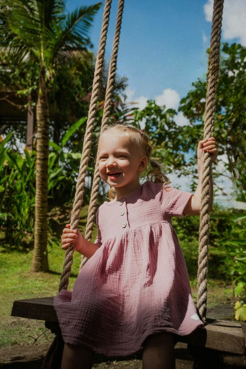 Her legs were swinging. Her pink dress was bunched awkwardly around her knees, and there was a paper plate with a half-eaten piece of cake in her lap.