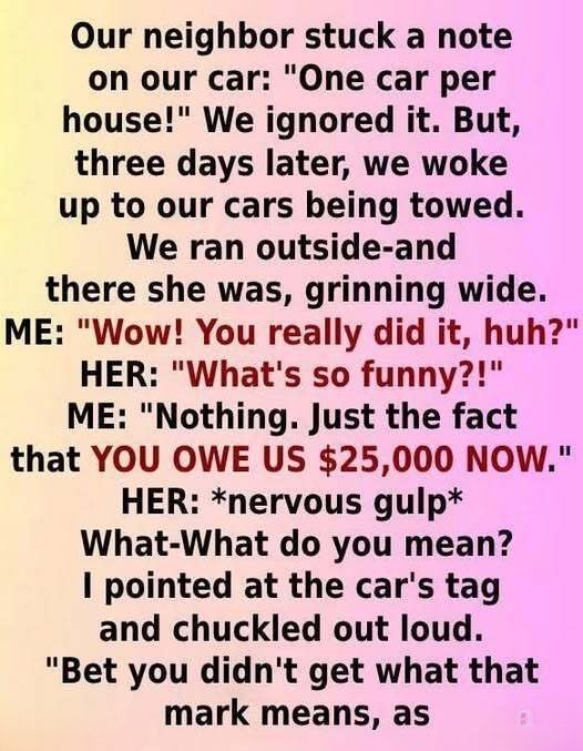 Our new neighbor had been upset about parking from the very first day we moved in. As we unloaded boxes from the moving truck, she immediately complained. “There should only be one car per house on this street,” she insisted, glaring at our two vehicles. We tried to reason with her—both cars were parked legally, just like everyone else—but she wasn’t having it. It quickly became clear this wasn’t about the law; it was her personal preference. Still, we figured it was a minor quirk and decided to ignore it.