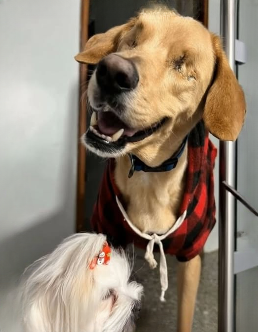 The transition to Maria’s bustling foster home was challenging. His world had shifted from familiar alleyways to tile floors, new scents, and constant activity. Medical examinations revealed the extent of his suffering: malnourishment, blindness, and an old, untreated leg injury. The prognosis was daunting. Yet Benki’s emotional intelligence shone. He quickly learned to read Maria’s voice and footsteps, memorizing the layout of the home in mere days. Unexpectedly, he bonded instantly with Luna, a tiny blind Chihuahua, forming a symbiotic partnership that amazed everyone. Luna’s high-pitched barks guided Benki, while he provided her with protection—a pair navigating the world as one.