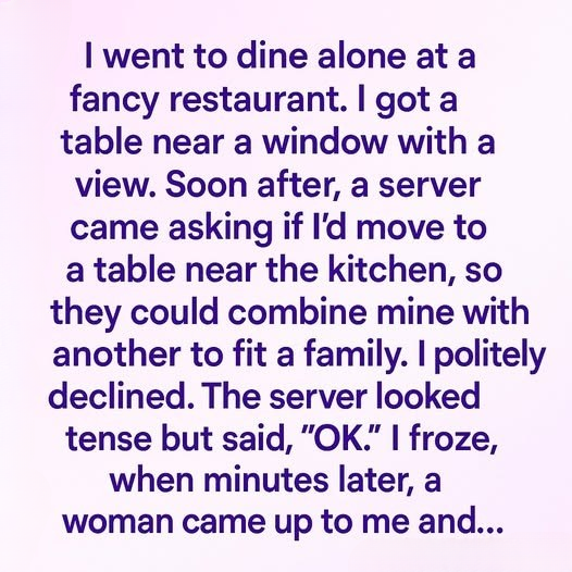 Minutes later, my server returned with a hesitant smile. “Would you mind moving tables?” he asked. “We have a large family who’d like to combine these two spots.”