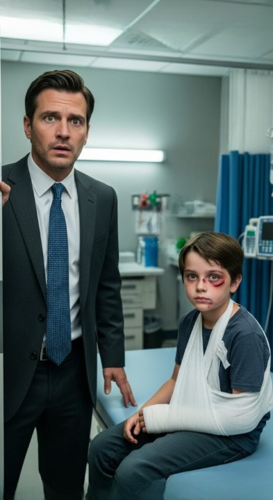 Twenty minutes later, I stood in the emergency room, the antiseptic air thick and sterile. A nurse led me through the corridors and opened a door. On the bed lay a boy, maybe seven, his right arm in a cast, his face scraped and raw. But what struck me most were his eyes—hazel-green, identical to mine.