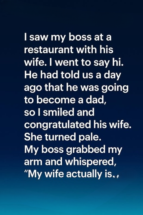 It was my boss, Michael, across from a woman I instantly recognized as his wife. The sight caught me off guard, and a sudden warmth of excitement rushed through me. Only yesterday, he had proudly announced to the team that he and his wife were expecting a child. My mind raced with the congratulations I had rehearsed. With a polite smile, I approached their table, trying to steady my nerves.