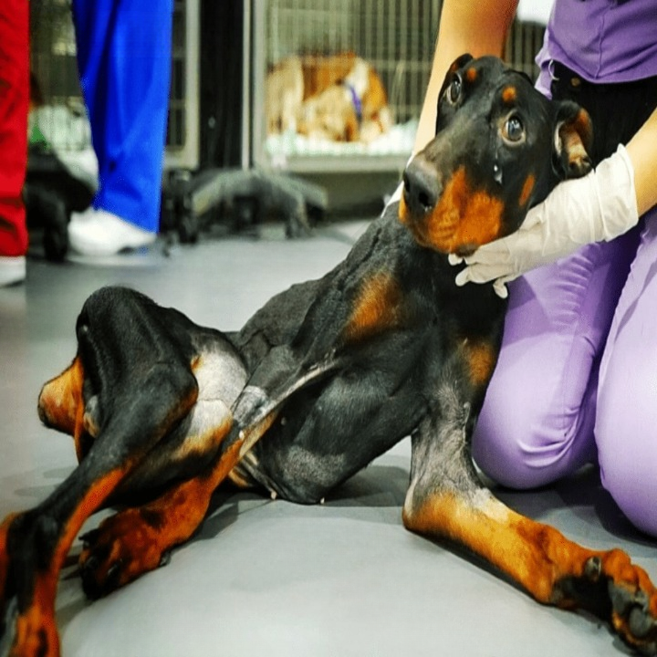 There lay Nancy, a Doberman reduced to little more than skin and bone, her frail body bearing the brutal marks of neglect. She was barely conscious, her eyes clouded with exhaustion and fear, but deep within them flickered a fragile plea — a quiet call for help that cut through the hearts of those who found her. Her twisted, weakened frame told a story of long suffering and abandonment, one that few creatures could endure. The air was thick with the stench of decay, but beneath it lingered something faint — the fragile scent of hope carried by the rescuers. It was a race against time now, a desperate struggle to reclaim one life from the edge of death. For Nancy, this moment — as gentle hands reached toward her trembling body — marked not the end of her pain, but the beginning of her fight to live.